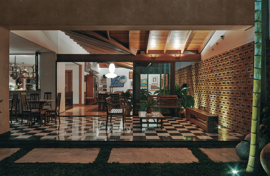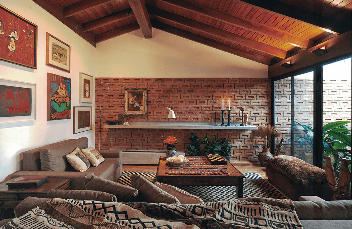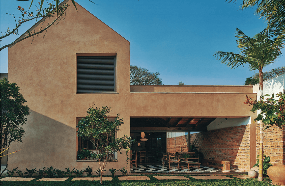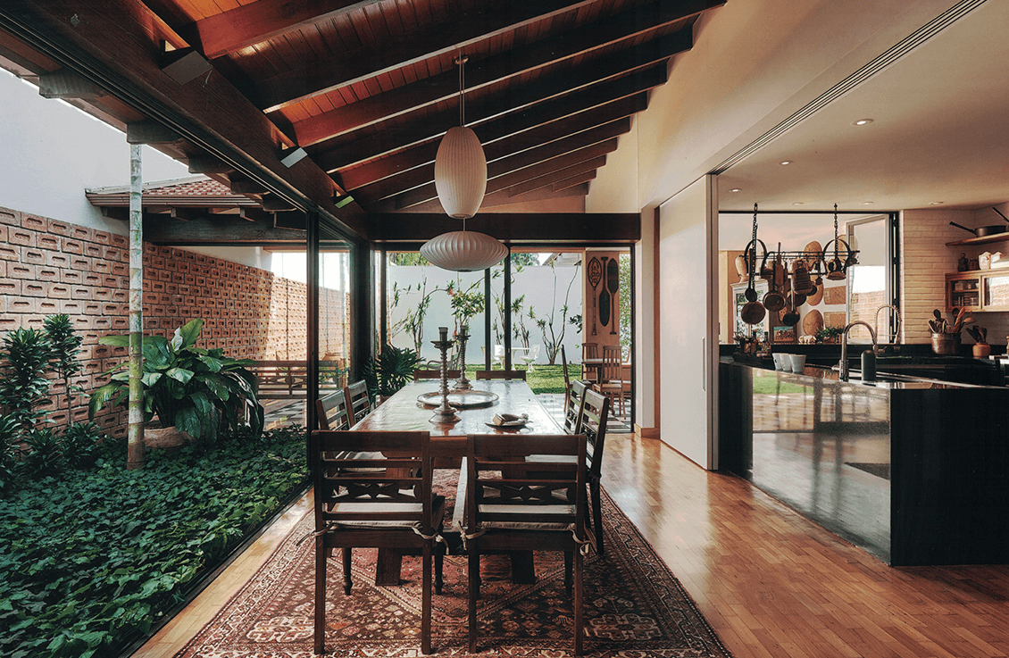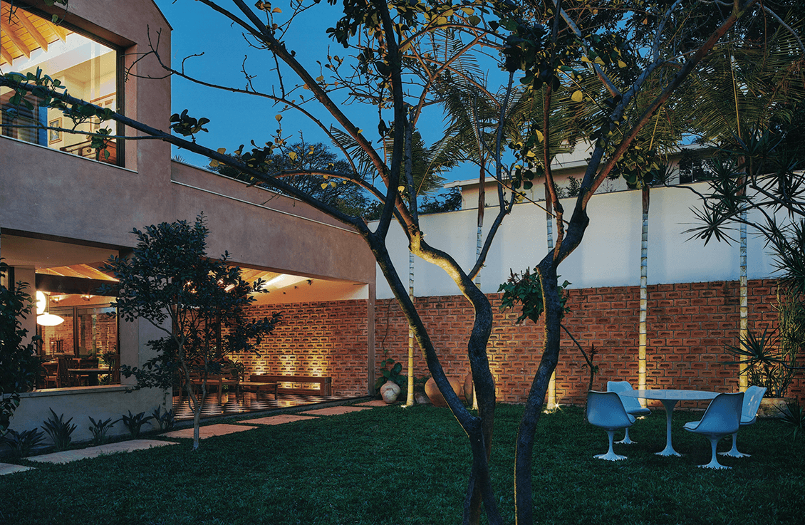 Residência em três pavimentos executada em estrutura de concreto armado, esquadrias de alumínio bronze, pisos em tacos de Peroba do Campo e Mármore Branco Especial, revestimentos em cerâmica e tijolos de demolição.