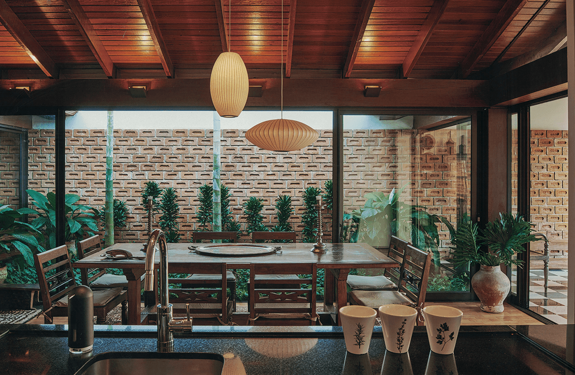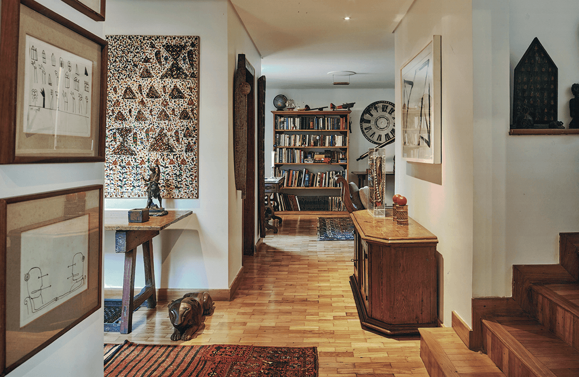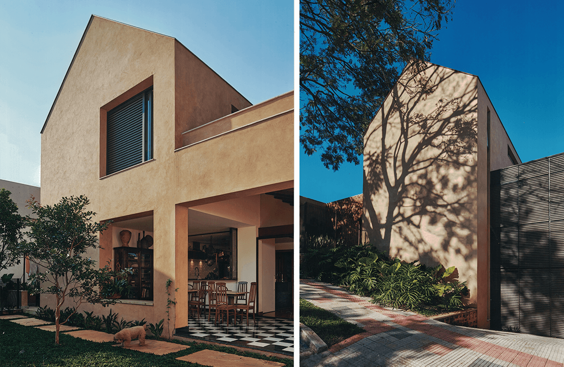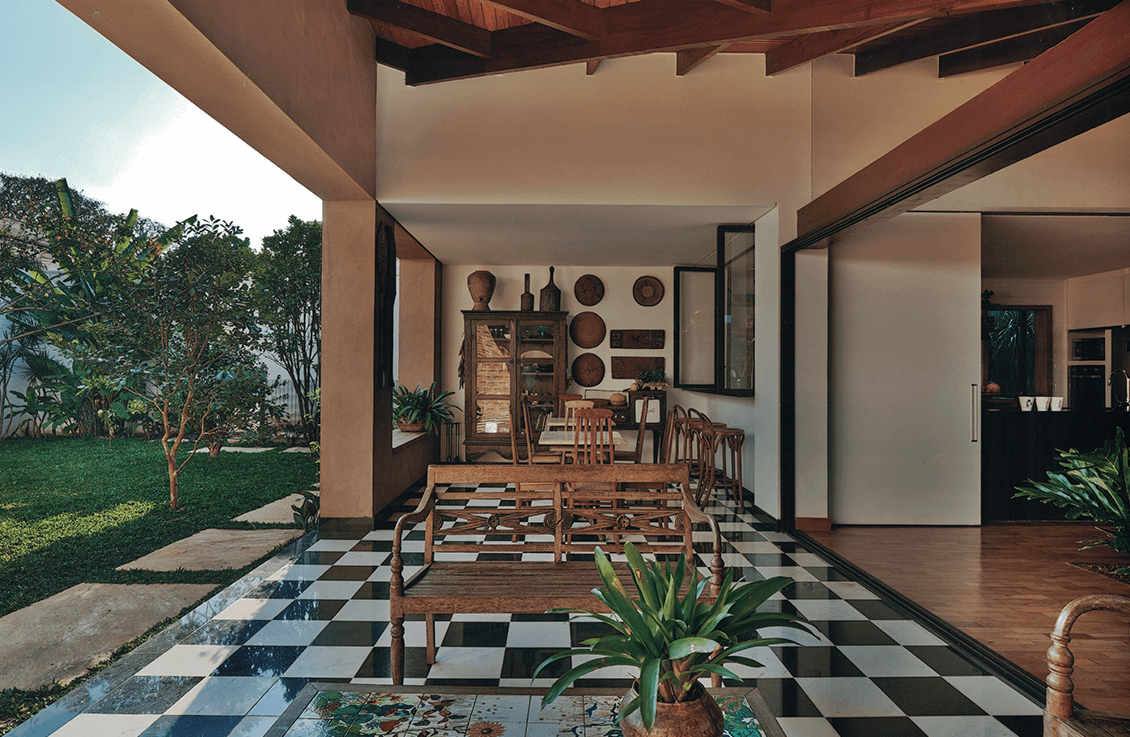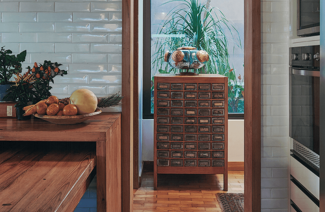 Residência em três pavimentos executada em estrutura de concreto armado, esquadrias de alumínio bronze, pisos em tacos de Peroba do Campo e Mármore Branco Especial, revestimentos em cerâmica e tijolos de demolição.