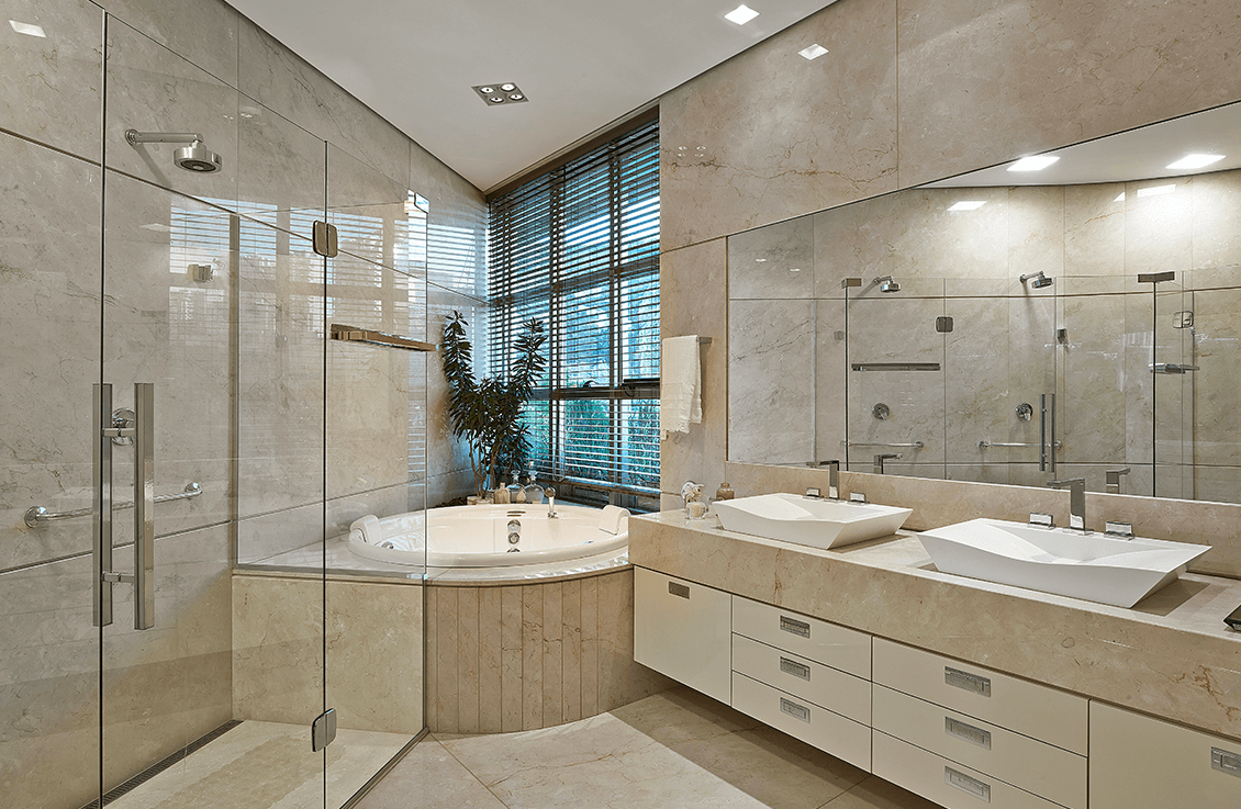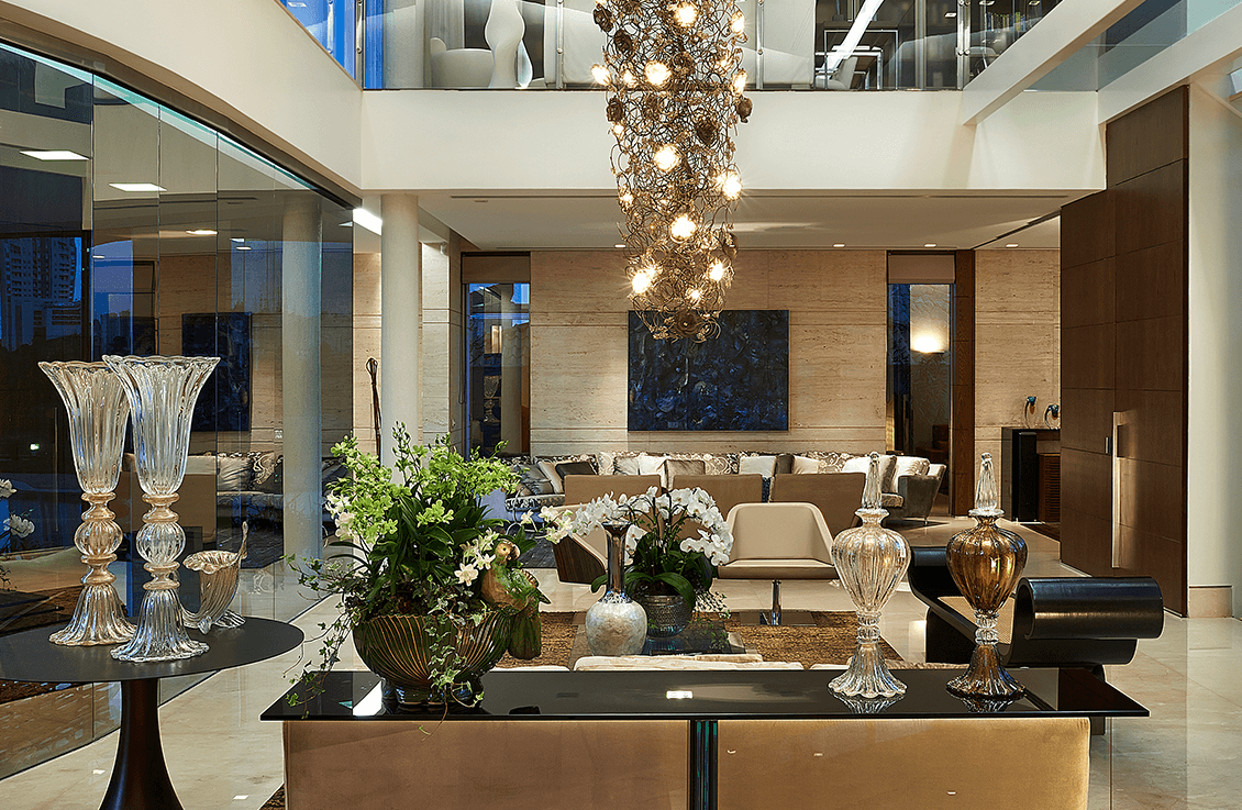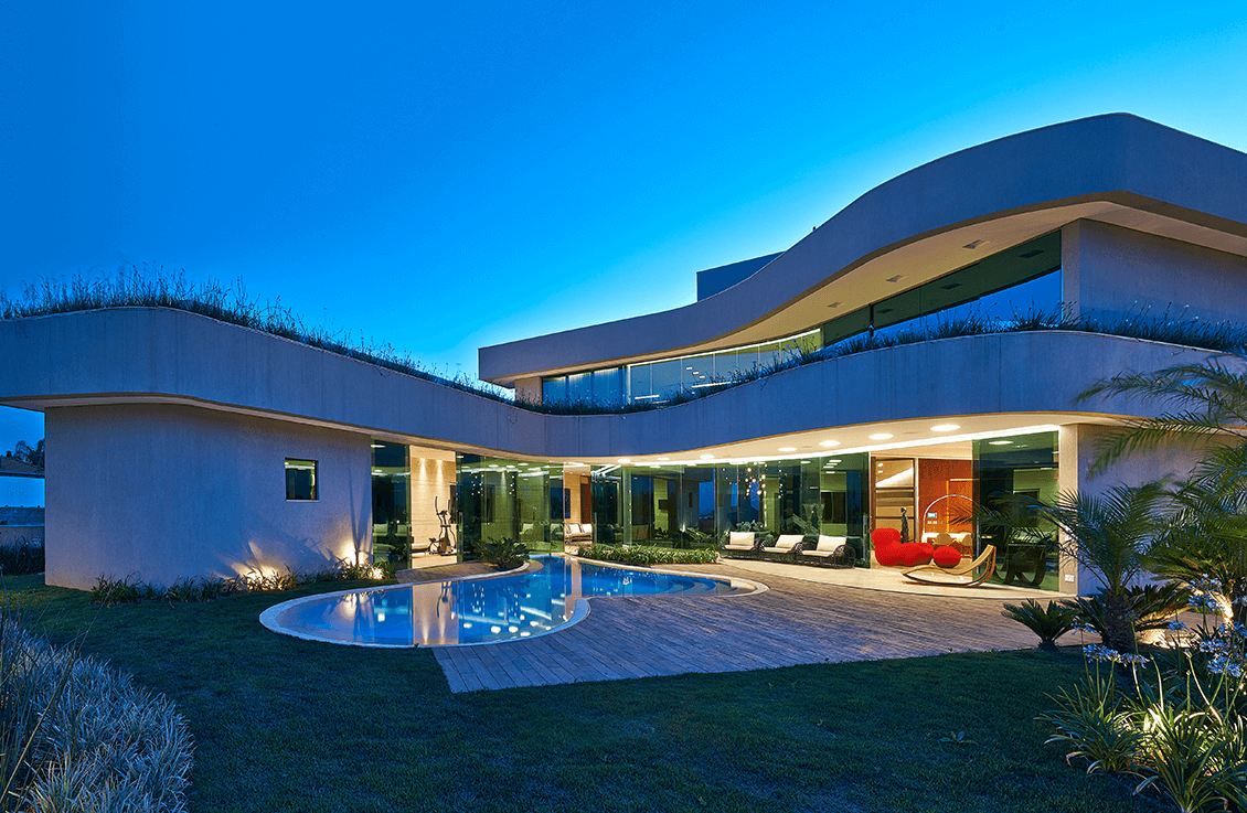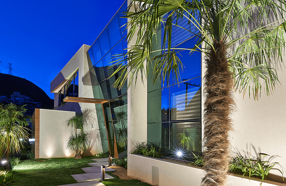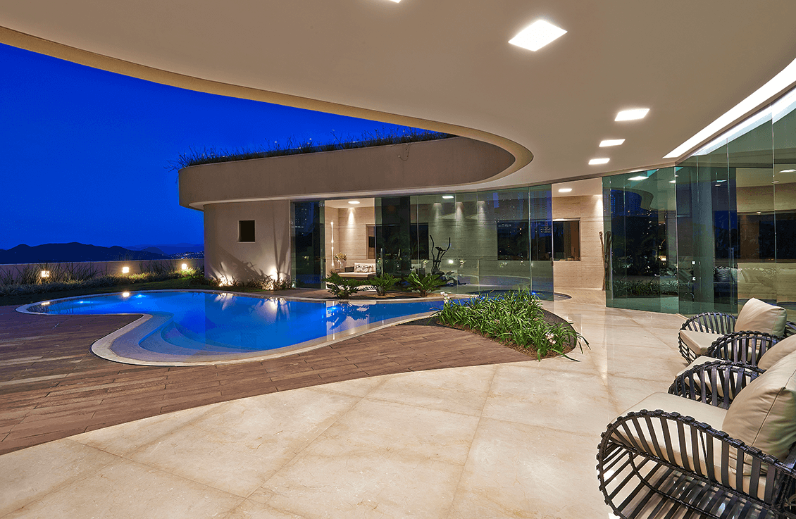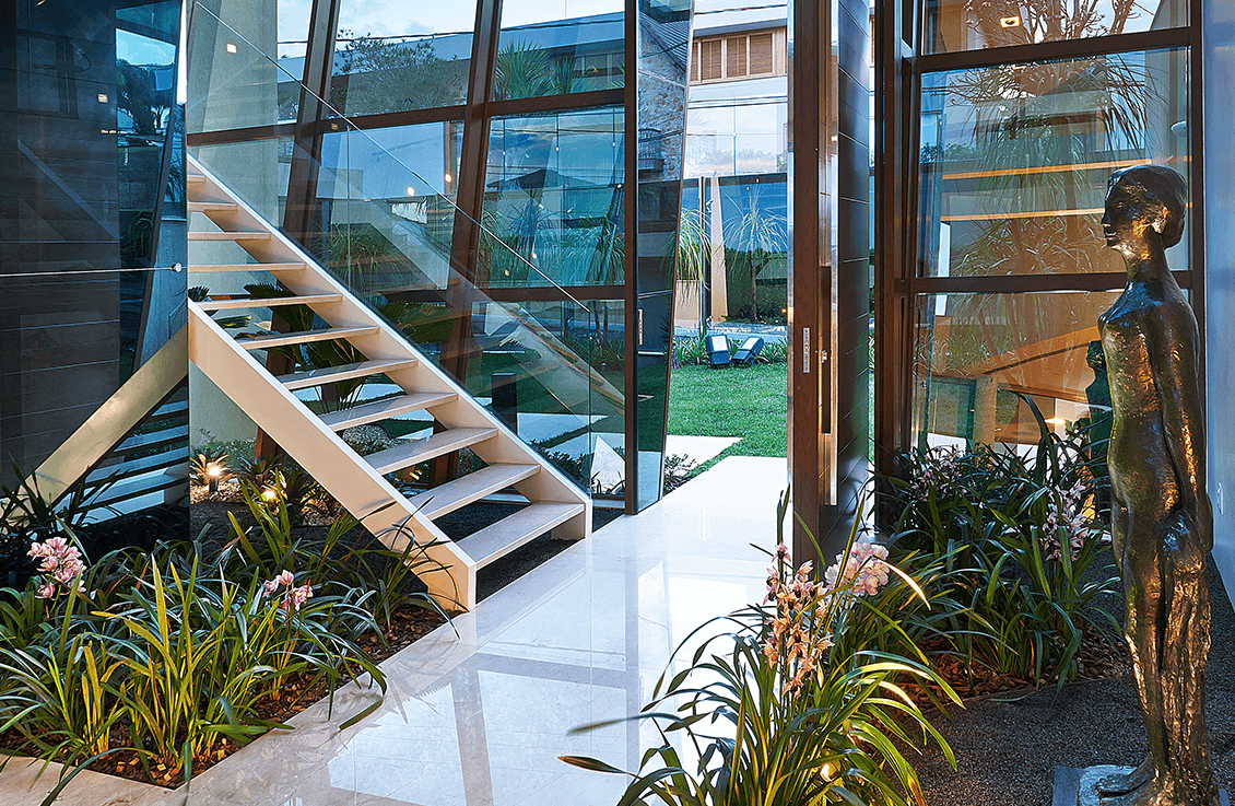 Residência com três pavimentos, executada em estrutura de concreto armado, esquadrias de alumínio com acabamento amadeirado, pisos e revestimentos em mármore Crema Marfil, Travertino Romano, Ônix e granito Preto Absoluto.