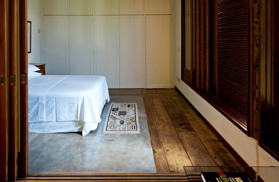 Residência em pavimento único, em estrutura de concreto, esquadrias de madeira Ipê, pisos em madeira de demolição, ladrilhos hidráulicos e cimentado artesanal nas cores cinza e vermelho.