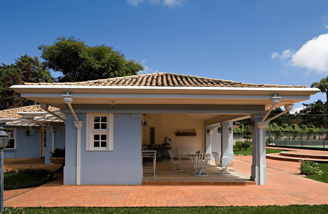 Residência em pavimento único com estrutura de concreto armado, esquadrias de madeira laqueada, pisos em cerâmica, mármore e tacões de madeira Ipê.